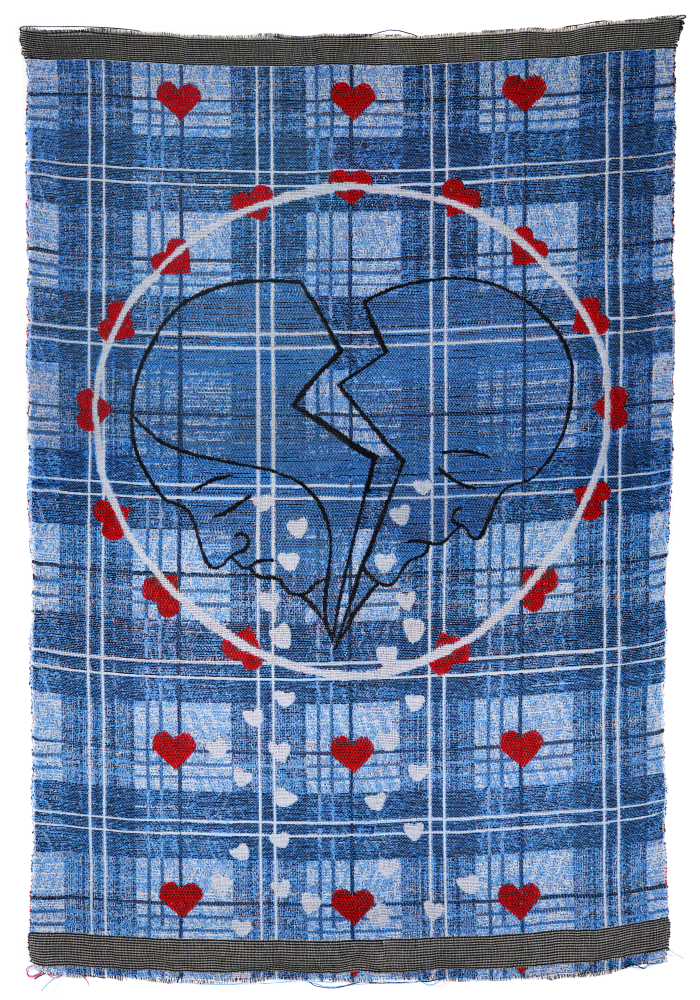 After hearing the stories, the idea of a broken heart emerged. It was said they were “crying tears of broken hearts, raining down on me”. The Covid cell circle has a circle of hearts. The tartan background is a reference to the many beautiful colours in the Highlands of Scotland, the many threads that make up the many stories of Covid and its impact. The quiet blue colours represent sadness and thoughts of those lost.